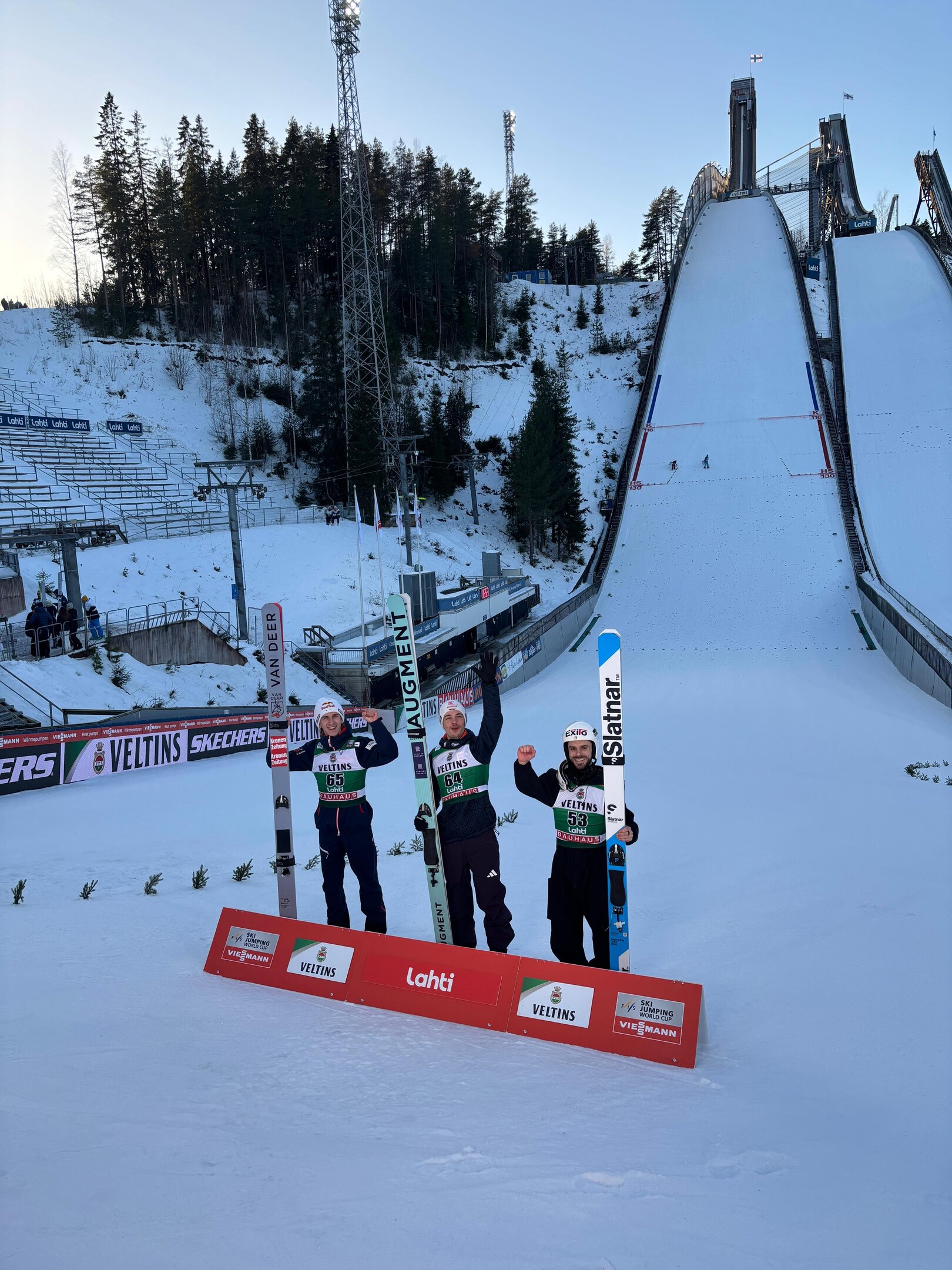Ein um einen Zentimeter zu langer Ski hat Domen Prevc am Freitag den Sieg in Lahti gekostet. Der Slowene wurde wenige Minuten nach dem vermeintlichen Sieg disqualifiziert. Weil aber der Japaner Ryoyu Kobayashi nur Sechster wurde, ist der Slowene mit 721 Punkten Vorsprung in den letzten sieben Springen nicht mehr von Platz eins zu verdrängen. Daniel Tschofenig erbte somit hinter dem Deutschen Philipp Raimund Rang zwei. Der dritte Platz ging an den Bulgaren Wladimir Sografski.